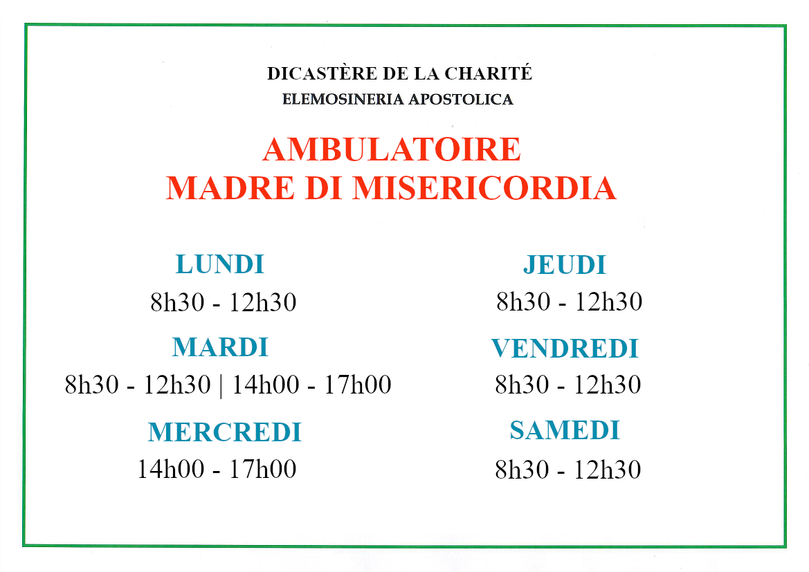 L’ambulatoire Madre di Misericordia est l’un des multiples services du Dicastère pour le Service de la Charité qui, offrant des soins de santé gratuits aux personnes vivant dans des situations de dénuement, de marginalisation, en se référant aux principes de l’Évangile et de la Doctrine sociale de l’Église. Il est située sur la place Saint Pierre, sous la colonnade de droite , dans les anciens locaux de la Poste du Vaticane. Est ouvert tous les jours du lundi au samedi. L’ambulatoire Madre di Misericordia offre chaque année plus de 15.000 services de soins à environ 8.000 personnes; ainsi que de nombreuses interventions grâce à des véhicules sanitaires mobiles qui lui permettent d’offrir ses services dans les zones périphériques de la ville, dans l’esprit de l’Église en sortie dont exhorte le Pape François